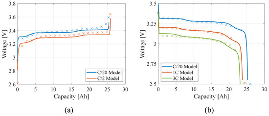 Model (solid lines) and experimental (crosses) comparison of the voltage profile of the single battery during (a) discharge and (b) charge at different current rates in LFP LIBs.