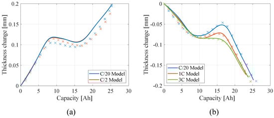 Model (solid lines) and experimental (crosses) comparison of the thickness change profile of the single battery during (a) discharge and (b) charge at different current rates in LFP LIBs.