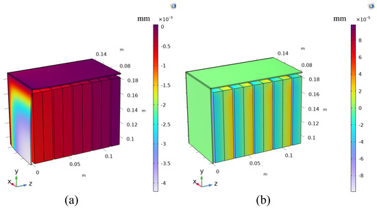 Deformation of the battery module (internal of the batteries plus case of the module) in (a) the design solution 1 and (b) the design solution 2. Thanks to the symmetry, just the top left of the battery module is explicitly simulated.