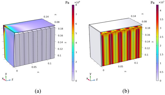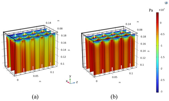 Stress in the z direction in the y-z plane cross section of the internal of the batteries in (a) design solution 1 and (b) design solution 2. Thanks to the symmetry, just the top left of the battery module is explicitly simulated.