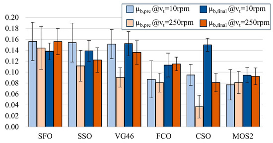 Interestingly, the friction coefficients of St bolts using FCO demonstrate a substantial dependency on both nt and vt, which is opposite to the trend reported in the literature using S235JR steel plates [35]. This can possibly be due to the increased pressure due to the higher applied preload which suggests that VG46 is forced out of the bearing region.