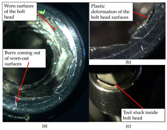 Worn-out bolt head showing (a) worn-out surfaces with burrs coming out of the head, (b) plastic deformation of surfaces before wear and tear of the surfaces, and (c) tool stuck inside bolt head when the surface of the bolt started to wear.