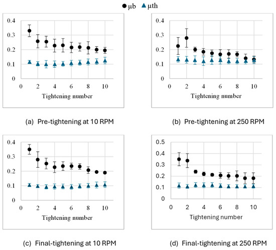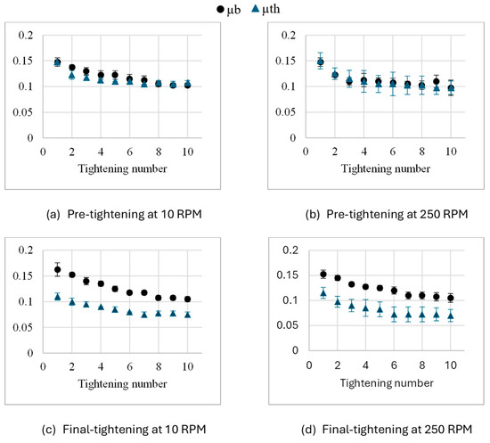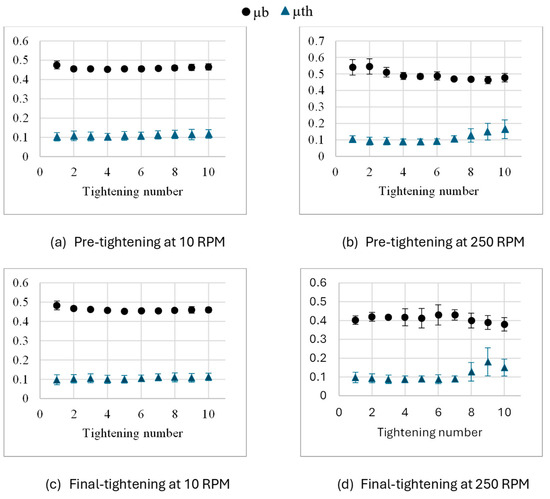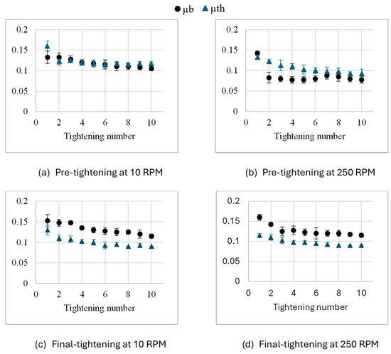 The evolution of the average friction coefficients of St screws using VG46 with the number of tightenings is shown in Figure 6. Coefficients of friction for tightening up to 30% of the final preload are shown in Figure 6a,b for tightening rotational speeds of 10 and 250 RPM. It is evident from the data that relatively high coefficients of friction are observed in the initial stage, which become stable after three to four tightenings. This outcome aligns with the findings reported in the literature [35]. This phenomenon can be attributed to the initial wear of the surfaces, which serves to remove the predominant peaks. Furthermore, it is observed that at 10 RPM, the friction coefficient is marginally lower during the initial tightening phase compared to 250 RPM. This observation can be attributed to the reduced centrifugal force at lower tightening speeds, leading to a higher effect of lubricant and, consequently, a lower friction coefficient.