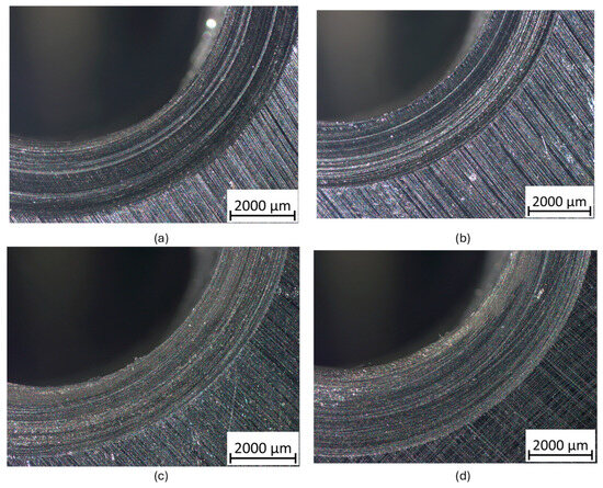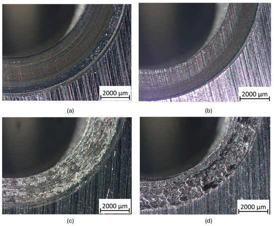 Microscopic observation of bearing plate surface after testing with VG46 against; St bolts at vt of (a) 10 RPM and (b) at 250 RPM, and Ti bolts at vt of (c) 10 RPM and (d) at 250 RPM.