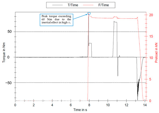 It is noteworthy that, at 250 RPM, the applied torque is 60 Nm; however, due to the inertial effect, the actual torque output exceeds 80 Nm. This results in a preload force (~19.5 kN max) that exceeds the preload achieved by tightening at 10 RPM (~16.6 kN max). This phenomenon is demonstrated in the actual tightening cycle in Figure 12. This is a critical factor to be considered when mounting screws using automatic procedures in practical scenarios.