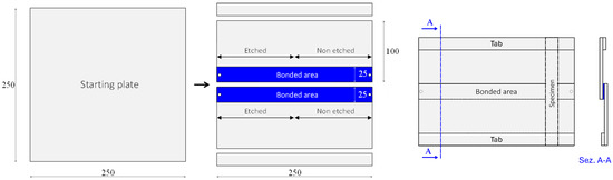 After optimization, the etching process was scaled up for larger panels (Figure 1), and joints were created by bonding halves of the panels along their long sides. Etching was applied to only half of the plate’s width, and shear tests were performed. It was found that both the pipette and soaking methods were unsuitable for large areas due to uneven acid distribution, so a brush was used for a uniform application. The bonding process involved cutting plates, cleaning, etching, and curing at 60 °C for 2 h under pressure. Calibrated glass spheres were added to control adhesive thickness, resulting in 0.15 mm. The process was successfully applied to a prototype panel–stringer joint, demonstrating feasibility for industrial-scale use.