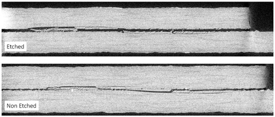 Same as for MAT1, quasi-static and fatigue tests on MAT2 showed no significant effect of etching on static and fatigue strength (Table 2), with cohesive failure observed in both etched and non-etched specimens. The fractured surfaces revealed a cohesive failure for all the configurations, justifying the insensitivity to the surface treatment. Micro-CT analyses, conducted after the fatigue tests, revealed that cracks propagated into the first layer of adherends in both etched and non-etched samples (Figure 3).