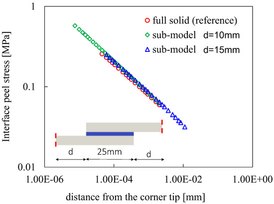 Before the application, the two-step method was numerically validated referring to a single-lap specimen with a 25 mm overlap, comparing the local stress fields with those from a full solid model. The results, shown in Figure 5, demonstrated excellent agreement, confirming the method’s accuracy in calculating the GSIFs.