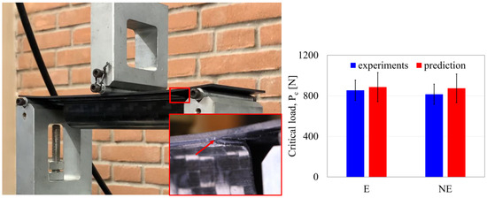 Setup of the three-point bending test with a magnification of the crack formation, together with the comparison between predicted and measured critical loads for crack initiation.