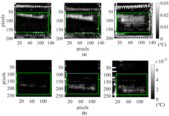 Figure 10 demonstrates the reference TSA results for a non-etched specimen (MAT1) at different fatigue cycle stages (2000, 60,000, and 119,000 cycles). These maps show the increasing extent of debonded areas, as indicated by the growing TSA signal. The results obtained in both cases demonstrated that the TSA signal is extremely low; in fact, the amplitude signal is around 0.03 °C in the case of the cooled IR sensor (Figure 10a), highlighting the challenges for SHM applications, especially for uncooled sensors (Figure 10b).