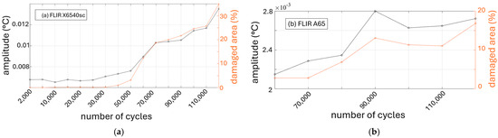 A quantitative analysis (Figure 11) of the debonded area as a function of the number of cycles was performed, showing that significant damage began to occur after approximately 30,000 cycles. This was consistent with the results from both high-cost cooled and lower-cost IR cameras, with the latter showing comparable accuracy in detecting damage despite increased signal noise.
