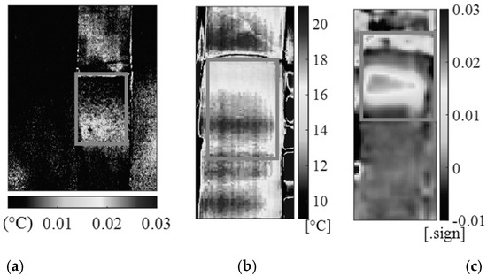 Comparison between TSA and stepped thermography: (a) TSA results with A65 camera, (b) BOSON camera, SHT amplitude map (Fast Fourier Transform—FFT—considering one cycle), (c) LEPTON camera, SHT 2nd Principal Component (one complete cycle of excitation analyzed by means of Principal Component Analysis—PCA).