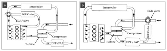 Schematic diagram of the most popular system on the market for EGR: high-pressure (a) and low-pressure (b) EGR.