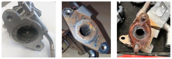 By cooling the gases, there is a decrease in peak temperature and combustion rate, leading to a 70% reduction in NOx emissions []. The EGR cooler is made of stainless steel or aluminum alloys. The materials chosen must provide excellent resistance to high temperatures and pressures (more than 700 °C and 3 bar) as well as chemical attack by condensed exhaust gases []. The EGR cooler, in general, is not to be considered a wear component; however, extreme temperature fluctuations and missing or aggressive coolant additives can cause leakage (internal or external). This may initially go undetected due to higher exhaust gas backpressure than coolant pressure (when the engine is running). To a more indirect extent, the accumulation of particulate matter and debris in the EGR system can also be a cause of failure. In the presence of cracks in the EGR cooler, exhaust gas pressure can drop sharply, leading to a major drop in engine performance due to a lack of boost pressure [].