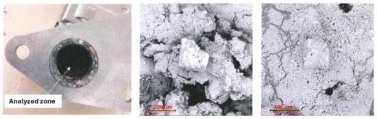 However, damage to the turbocharger is not solely caused by the lubricant; polluted exhaust gases also play a role. As an example, the analysis results from a failed turbocharger of a gasoline vehicle are represented below, specifically focusing on the turbine near the impeller. Analysis of the solid residue by SEM reveals the presence of irregular and various particles, as shown in Figure 8; EDS analysis on one of these particles reveals that this residue consists of carbon, oxides, and other elements, among which, chlorine appears in the amount of about 2.7%.
