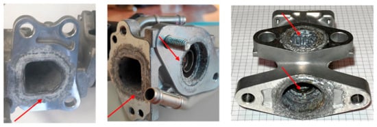 Many components from vehicles of different brands and models, combined with the previously illustrated coolers, were also analyzed to examine the valves. Visually, the presence of chlorine has already caused an abnormality. Indeed, even in this component, there are copious traces of oxidation in the areas integrated by the passage of gases, such as at the interface with the cooler. Figure 4 shows some damaged components; the red arrows highlight the part where corrosion is present.