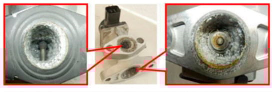 In the latest generation of powertrains, the need to lower concentrations of NOx has forced the use of high-efficiency EGR systems to treat exhaust gases before they make their final steps to the outside environment []. EGR systems work by recirculating a portion of the exhaust gases back into the cylinders. The exhaust gases reintroduced into the chamber join the fresh charge fed in by acting as an inert gas, which absorbs the heat generated during exothermic reaction and dilutes the concentration of oxygen in the combustion zone. This lowers the combustion temperature and consequently significantly reduces NOx emissions.