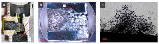 (a) sectioned of a damaged EGR valve; (b) stereomicrograph of the specimen; (c) 100× SEM detail.