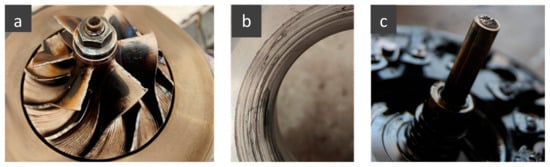 Lack of power and reduced powertrain performance are the first signs of damage to the turbocharging system due to the introduction of chlorine-adulterated fuel into the vehicle. Chlorine in the oil causes oxidation and scoring of the bearings and washers that support the turbo shaft. Indeed, the shaft of the vane element has a certain amount of clearance to allow the lubricant to create the sustaining meatus; it happens that due to the corrosion caused by chlorine, the width of the clearance increases, causing the sustaining system to lose efficiency. The turbine/compressor vane assembly then begins to streak against the crankcase, and in addition to damage, significant overheating develops due to steel/steel contact at high speed []. Thermal conduction causes the oil in contact with the overheated parts to deteriorate, drastically reducing its viscosity, and leading to disastrous consequences for the components it impacts []. The phenomenon is self-exacerbated, and the contact of the impellers with their crankcases becomes more and more severe until scoring with consequent torsion failure of the shaft. Figure 7 shows the elements that suffer from this type of failure.