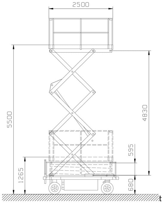 The main parameters for the scissor lifter design are as follows: a maximum working load limit of 3000 N; a working platform height of 5.5 m; and a platform length of 2500 mm. The number of cycles is 320,000, and the load spectrum factor is one, i.e., the platform is always lifting the maximum load. Figure 1 shows the main dimensions of the machine.