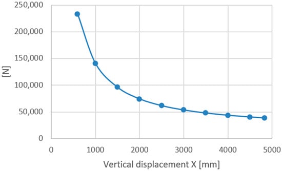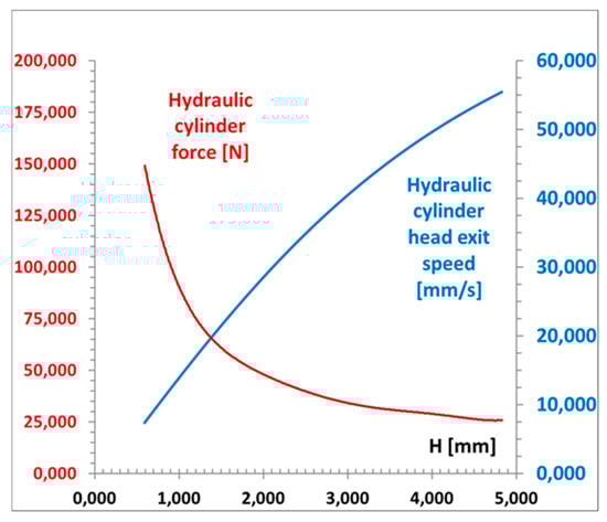 It can be seen that the maximum action occurs at the lowest position of the platform; the action exerted by the hydraulic cylinder decreases as the height of the platform increases.