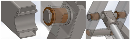 The geometry of the beams is a classic tubular structure with dimensions of 150 × 100 × 5 mm. The pin diameter is 65 mm. Figure 5 shows details of the beam and pin.