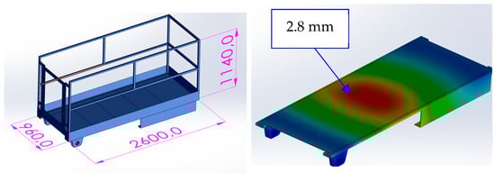 Figure 6a shows the main dimensions of the basket, designed using S275 JR steel, while Figure 6b presents the displacement results from finite element model analyses on the walking floor, considering the external load (payload) applied at the center of the base.