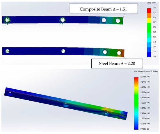 Figure 9 shows the finite element analysis results for the beam and compares the results between the steel and composite material solution.