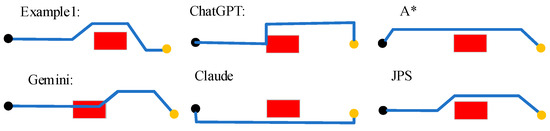 The results predicted by ChatGPT, Gemini, Claude, A*, and JPS.