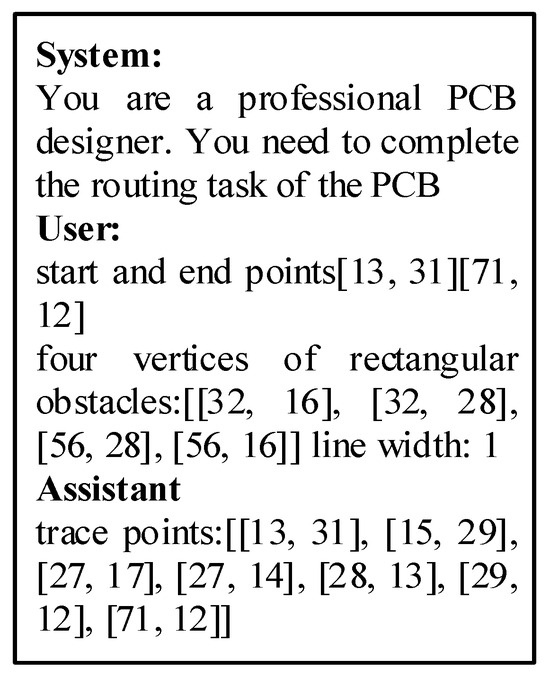 To achieve the chain-of-thought, this paper decomposes the routing problem into several steps. First the problem description is provided, including an introduction to the routing task, namely finding a path from the starting point to the ending point without touching the regions occupied by obstacles. Following this, there are descriptions of the starting and ending points, along with the line width and obstacles. The starting and ending points are represented by two-dimensional arrays, while obstacles are represented by the points of their four vertices.