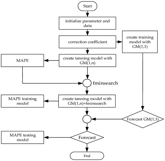 Figure 1 presents a flowchart for designing an optimization-based forecasting algorithm using fminsearch in MATLAB, commonly applied in predictive analysis. The algorithm begins with the initialization of parameters and data relevant to the system or process being modeled, establishing baseline inputs for accurate forecasting. Following initialization, a correction coefficient is applied to adjust initial conditions or account for potential discrepancies in data, enhancing model accuracy. The process then diverges to create two distinct predictive models, GM(1,1), a single-variable gray model, and GM(1,n), a multivariable extension, both of which are tailored for systems exhibiting uncertain or limited data, a typical scenario in electrical engineering applications like load forecasting or fault prediction. To validate these models, the mean absolute percentage error (MAPE) training model was used to evaluate each model’s accuracy in capturing the underlying trends and variations in the data.