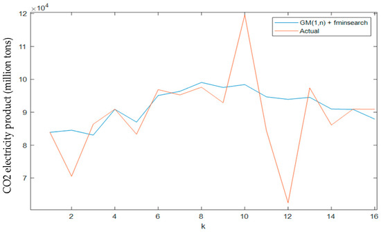 A model was developed using the GM(1,n) technique to estimate carbon dioxide emissions from the electricity production sector, with one dependent variable and three independent variables. The GM(1,n) model, where n = 4, yielded the following parameter values: [2.1235, 27.0509, 0.0005, −56.4652]. The simulation results are presented in Figure 2.