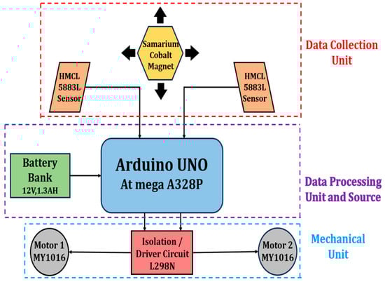 The main objective of the system’s data collection unit is to measure the magnetic intensity of the magnet. This system compresses the two magnetometers placed on opposite sides for a three-dimensional location calculation system. The magnetometer used in the system is HMCL 5883L (Honeywell Aerospace, Phoenix, AZ, USA). The magnetometers are calibrated with the intensity of the magnet to provide the instruction. The magnetometers are stationary and measure the magnetic strength of the magnet from both sides to have four directional motions, as shown in Figure 2.