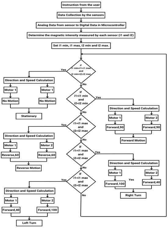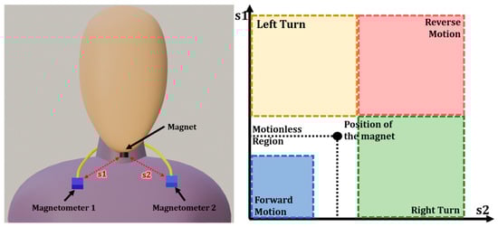 In Figure 4, the instruction for a left turn is to turn the person’s mandible to the left side. As the mandibular turns to the left side, the distance between the magnetometer 1 and the magnet increases, and the distance between the magnetometer 2 and the magnet decreases. So, the value of s1 will be much higher than the value of s2, resulting in a left turn of the wheelchair. The instruction for a right turn is to turn the person’s mandible to the right side. As the mandibular turns to the right side, the distance between the magnetometer 1 and the magnet decreases, and the distance between the magnetometer 2 and the magnet increases. So, the value of s1 will be much lower than the value of s2, resulting in the right turn of the wheelchair.