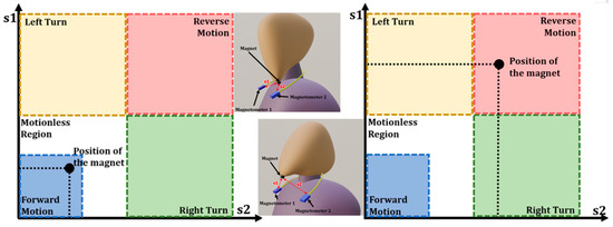 In Figure 2, the instruction for the wheelchair to stay stationary is shown as a standard position of a human mandibular region. At this condition, the values of s1 and s2 are almost equal, and as shown in the graph, the magnet remains in the Motionless Region.