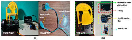 Figure 6a shows the hardware setup of the proposed system with a scaled-down model of a wheelchair. Figure 6b shows the hardware description of the proposed system. The two magnetometer sensors are mounted on a sensor holder in an elastic neckband. This neckband will be set around the neck and will remain stationary. The magnet will attach to the bottom of the mandibular region of a human using the suction pad, as the suction pad does not cause irritation or discomfort for the person. As Mandibular motion is a daily basic movement pattern, it will be easy for disabled people and persons with Quadriplegia to learn the instructions of the system.