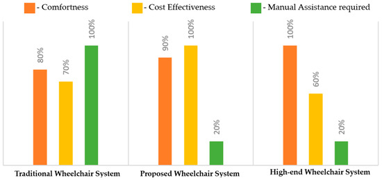 A concise comparative analysis was conducted for the proposed wheelchair control system alongside two other wheelchair control systems. The comparison focused on three key factors: cost-effectiveness, comfort, and the level of manual assistance required for optimal functionality. Cost-effectiveness was prioritized as a critical business consideration, while comfort was emphasized due to the extended periods users spend in wheelchairs. The need for manual assistance was also evaluated to assess the system’s operational efficiency. The first system analyzed was a traditional wheelchair, which lacks electronic components to enhance reliability. While it is the most affordable option, it falls short in terms of comfort and requires constant manual assistance, making it less cost-effective in the long run. The second system, the proposed wheelchair, incorporates essential electronic components to improve reliability and durability. It strikes a balance between cost-effectiveness and comfort, requiring minimal manual assistance only in critical situations. The third system, a high-end wheelchair control system, utilizes advanced electronic components and premium materials, resulting in significantly higher costs. This detailed comparison is visually represented in Figure 7 for clarity and ease of understanding.