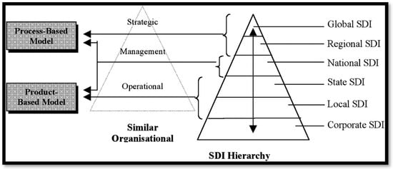 Since the forecasting of disasters requires geospatial data, it is important for the aforementioned information to be accessible to everyone who is involved in disaster mitigation. When one considers that the target of SDIs is to provide spatial datasets, SDIs are divided into six different levels, for which more detailed data can be derived from corporate SDIs, as illustrated in the SDI hierarchy model in Figure 1, namely, different SDIs at the corporate level, which supply the different levels of spatial datasets and, more specifically, local SDIs []. Hence, each level of the SDI hierarchy is developed by the incorporation of spatial datasets produced at lower levels according to the administrative division.