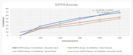 | Standard Ascorbic Acid IC50 Value: 315.76 | Root Extract IC50 Value: 423.62 | Aerial Plant IC50 Value: 486.39 | %RSA | |