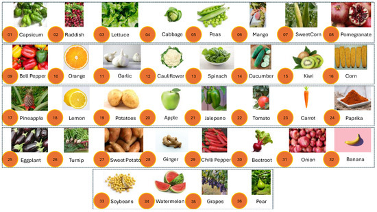 - Seth, K. Fruits and Vegetables Image Recognition Dataset. 2022. Available online: https://www.kaggle.com/datasets/kritikseth/fruit-and-vegetable-image-recognition (accessed on 10 February 2025).