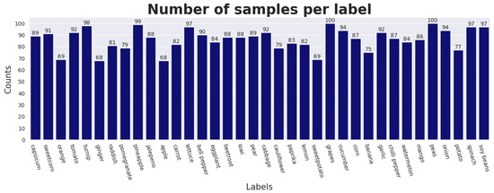 The dataset used in this study is taken from Kaggle, and is available as “Fruits and Vegetables Image Recognition Dataset” [25]. comprises images of various fruits (banana, apple, pear, grapes, orange, kiwi, watermelon, pomegranate, pineapple, mango) and vegetables (cucumber, carrot, capsicum, onion, potato, lemon, tomato, radish, beetroot, cabbage, lettuce, spinach, soybean, cauliflower, bell pepper, chili pepper, turnip, corn, sweetcorn, sweet potato, paprika, jalapeño, ginger, garlic, peas, eggplant). In total, there are 36 different classes with each class consisting of 100 images for training, 10 for validation, and 10 for testing. Note that since the dataset has been collected by performing the Bing search (as mentioned in the Kaggle repository), the size and format of each image differs significantly from each other. However, most images in this dataset are colored images and available in RGB. Some sample images from the dataset are shown in Figure 1. The distribution of classes in the dataset is shown in Figure 2.