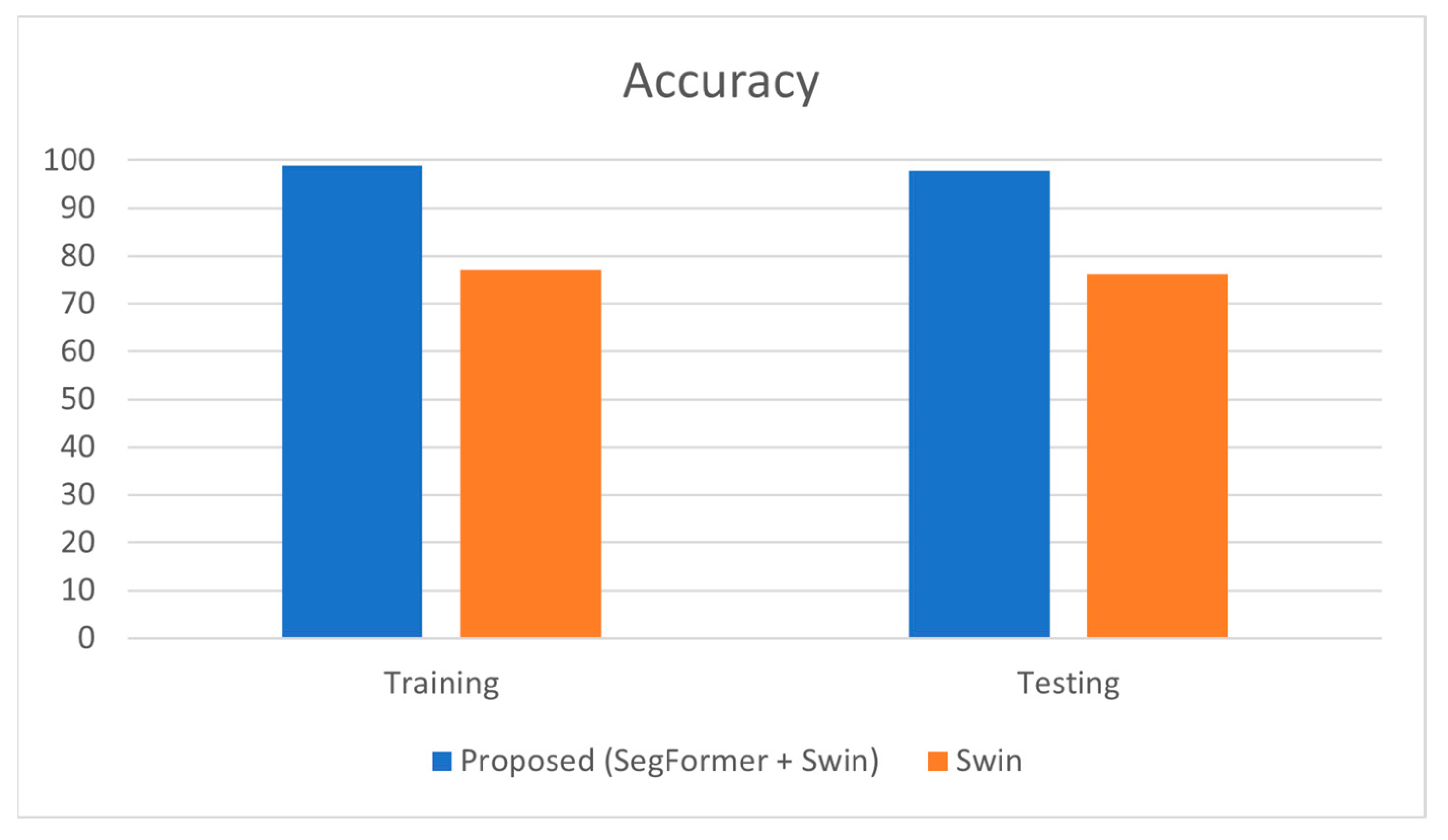 The performance metrics highlight this efficiency and accuracy. The proposed model, which combines SegFormer for segmentation and Swin Transformer for classification, achieved outstanding results.