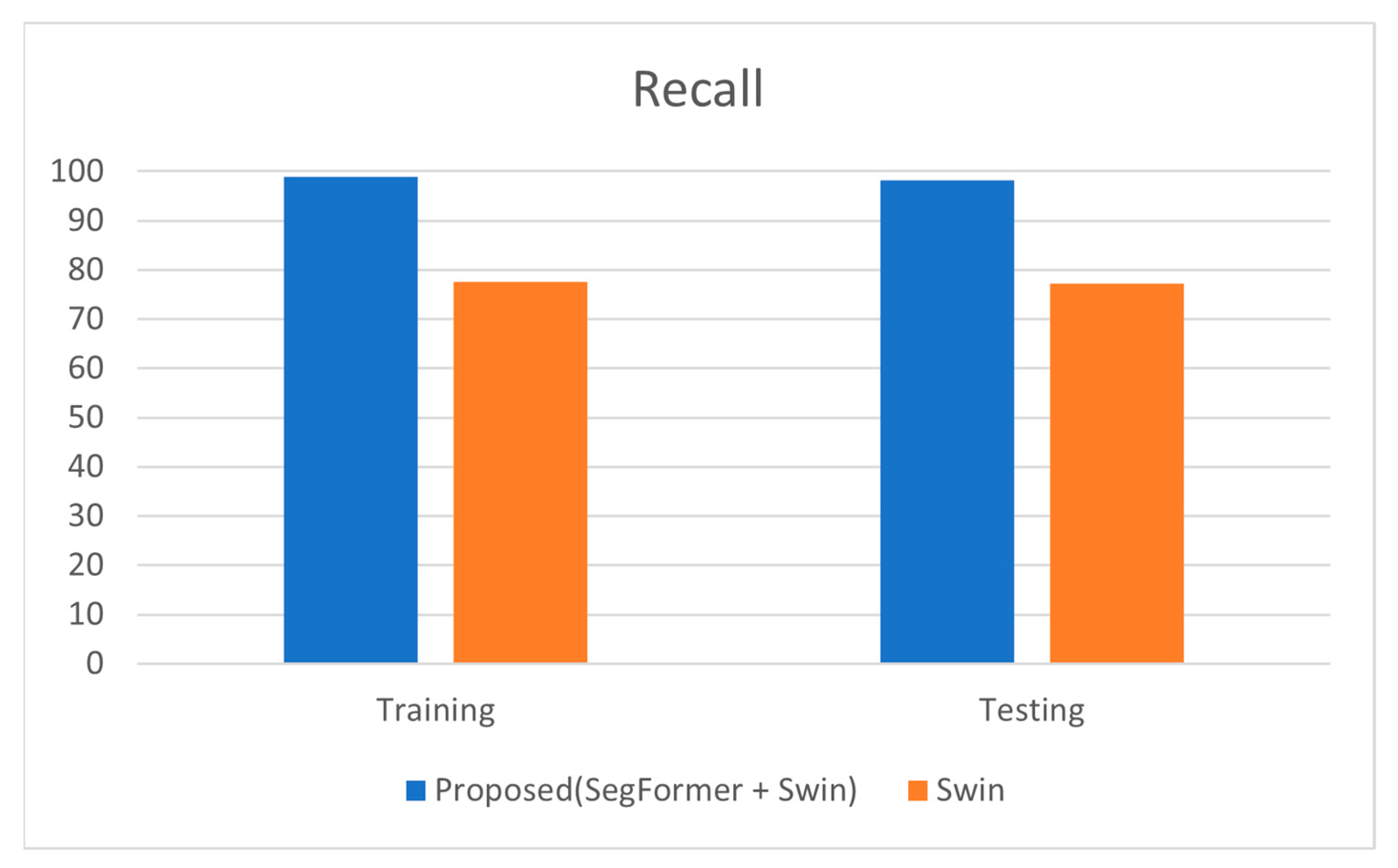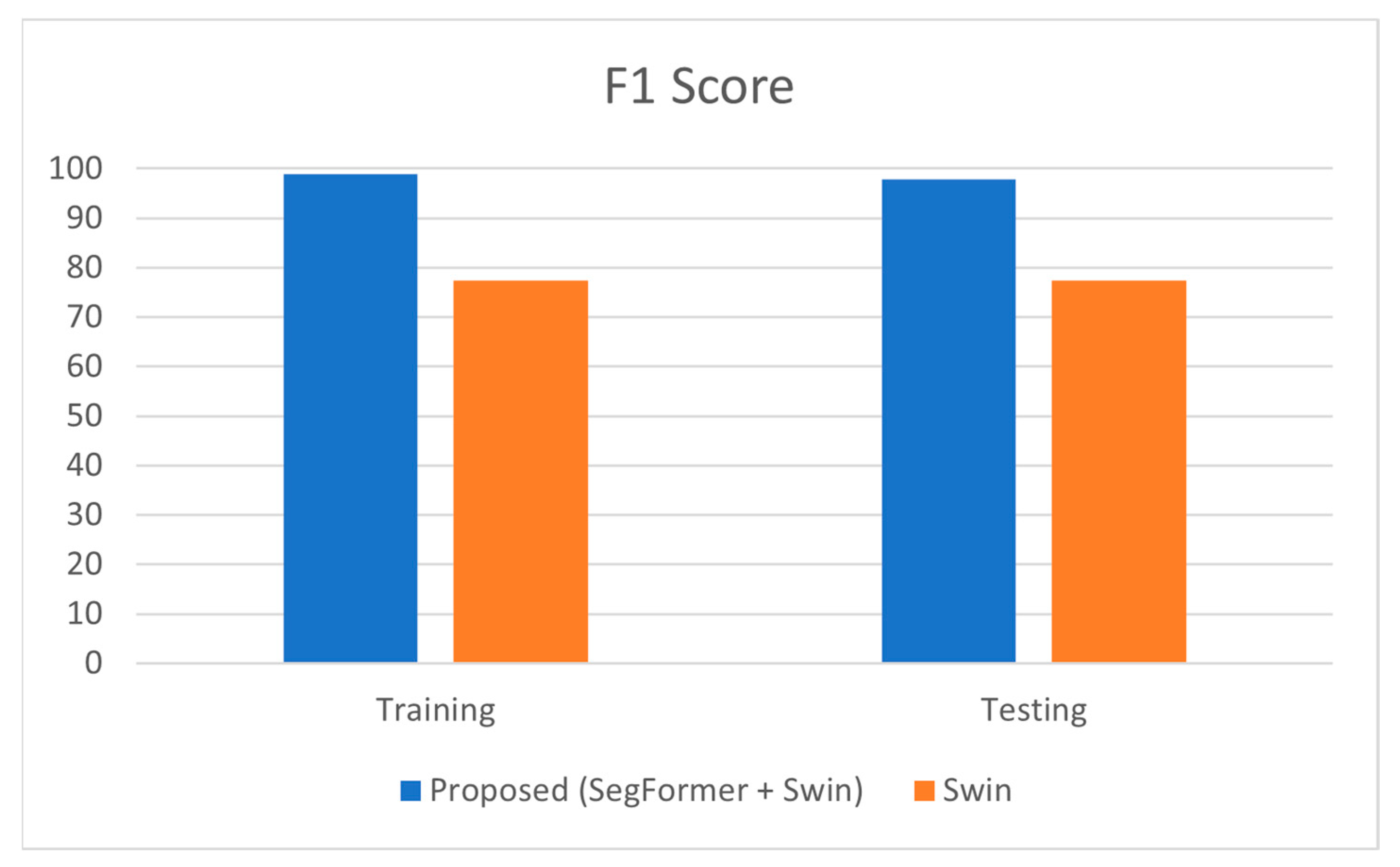 The F1-score, which combines precision and recall into a single metric, was 98.92% for training and 97.9% for testing in the proposed model. In contrast, the Swin Transformer model achieved an F1-score of 77.4% (training) and 77.39% (testing).