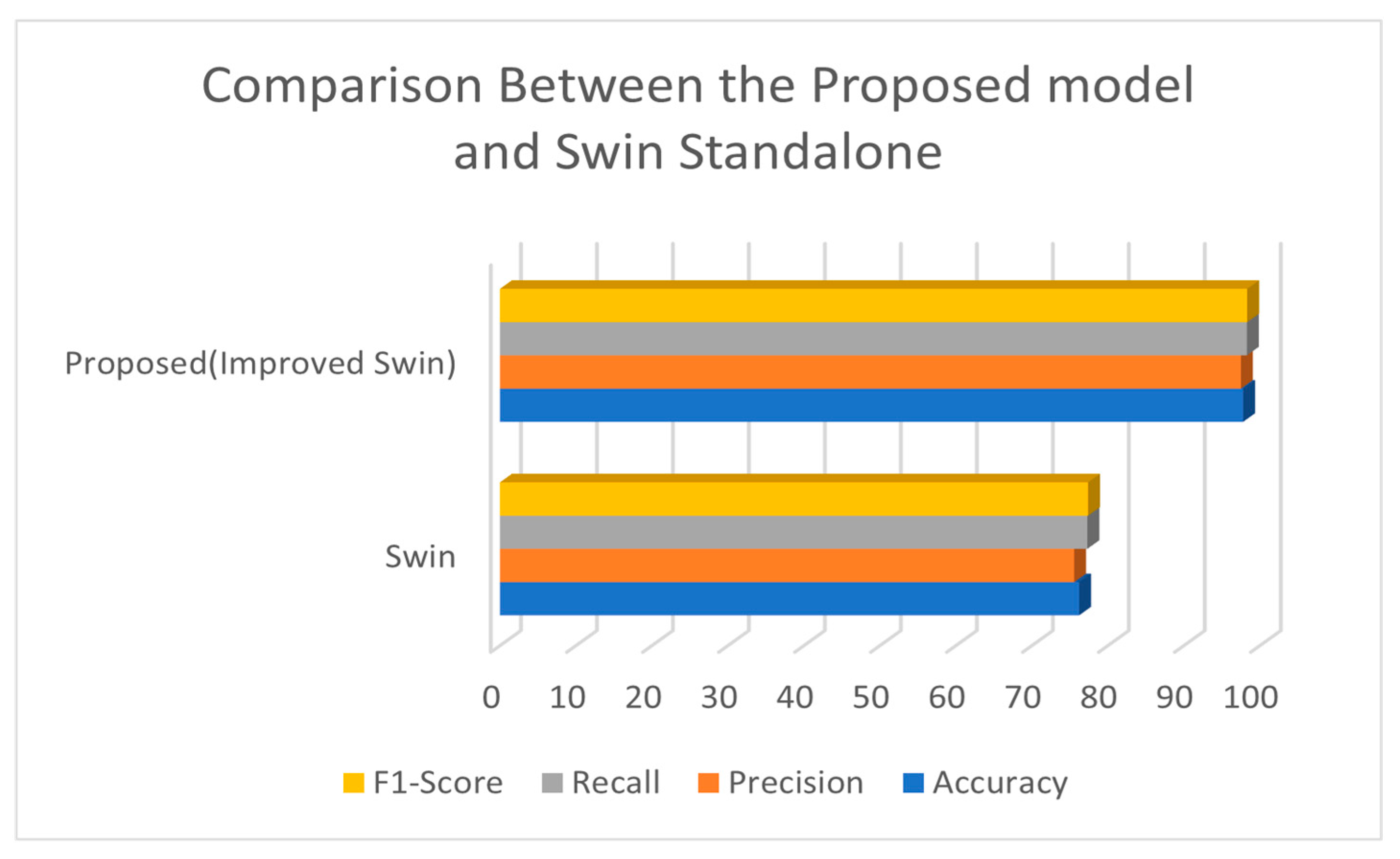 Table 3 presents the estimation of accuracy that was obtained, the proposed model achieved an accuracy of 98.9% during training and 97.8% during testing, whereas the Swin Transformer alone achieved 77% (training) and 76.22% (testing).