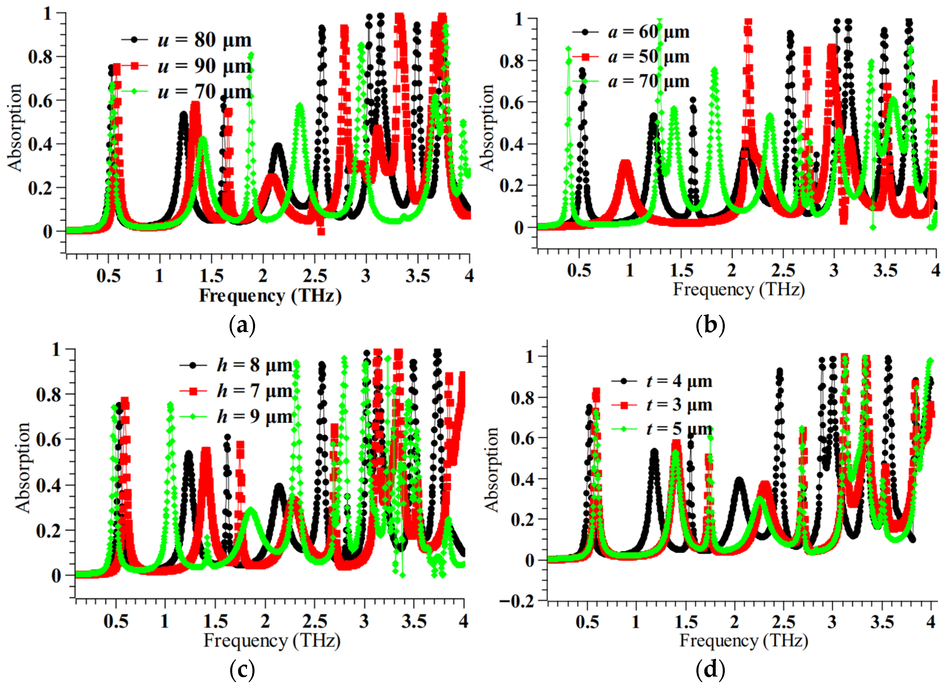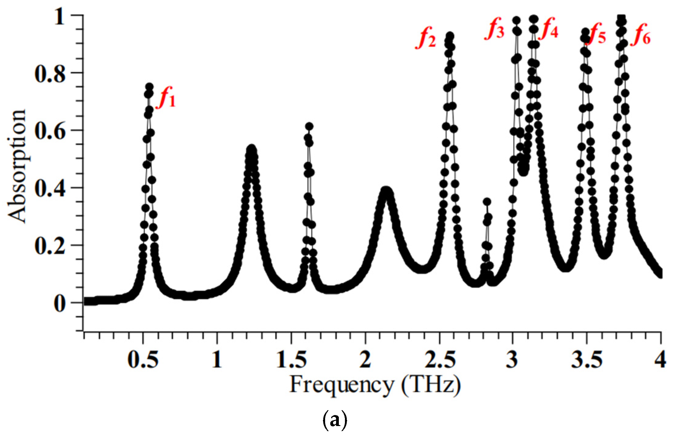 - Wang, B.X.; Zhai, X.; Wang, G.Z.; Huang, W.Q.; Wang, L.L. Design of a Four-Band and Polarization-Insensitive Terahertz Metamaterial Absorber. IEEE Photon. J. 2014, 7, 4600108. [Google Scholar] [CrossRef]