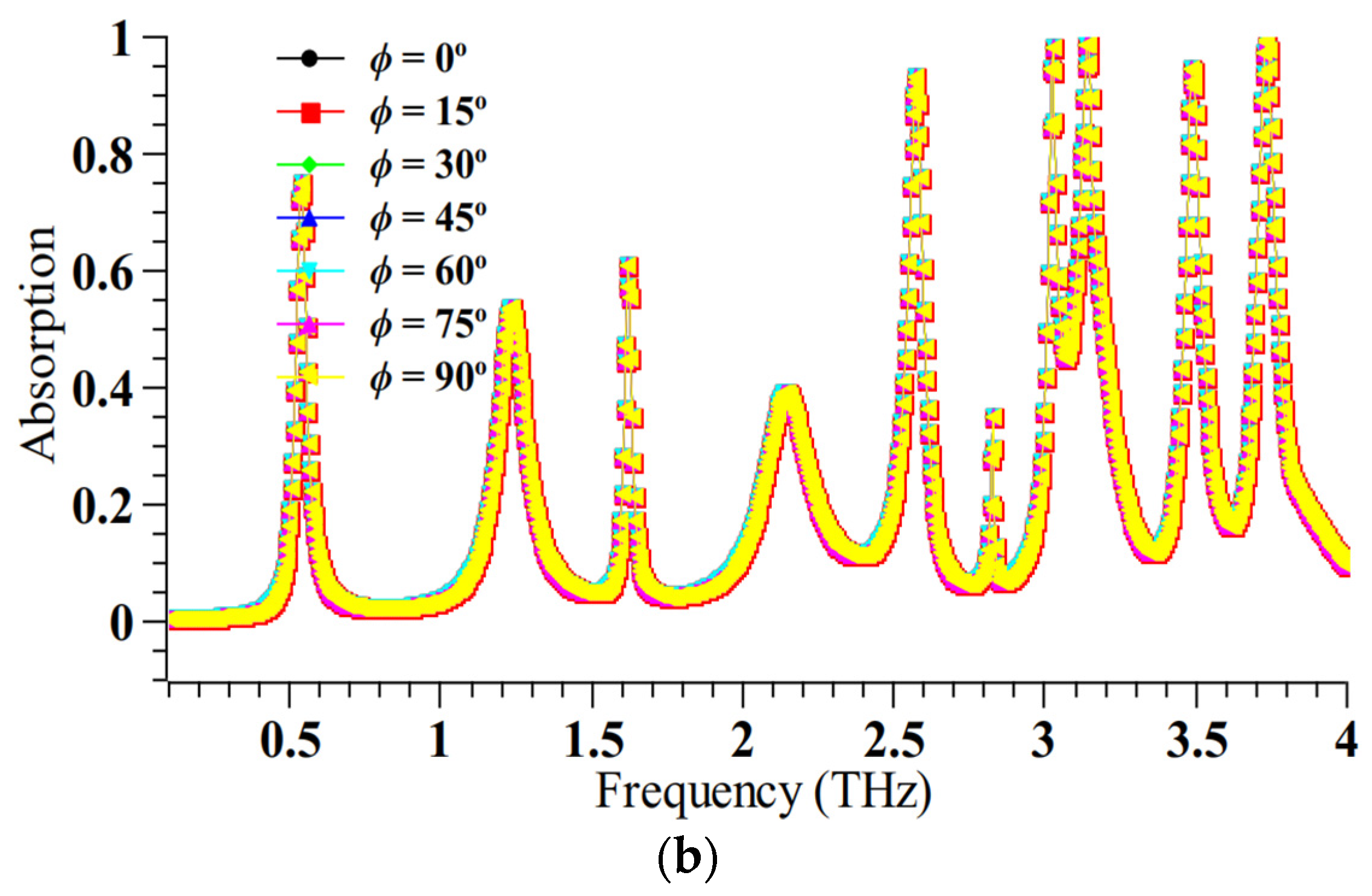 - Jain, P.; Prakash, K.; Khanal, G.M.; Sardana, N.; Kumar, S.; Gupta, N.; Singh, A.K. Quad-band polarization sensitive terahertz metamaterial absorber using Gemini-shaped structure. Results Opt. 2022, 8, 100254. [Google Scholar] [CrossRef]