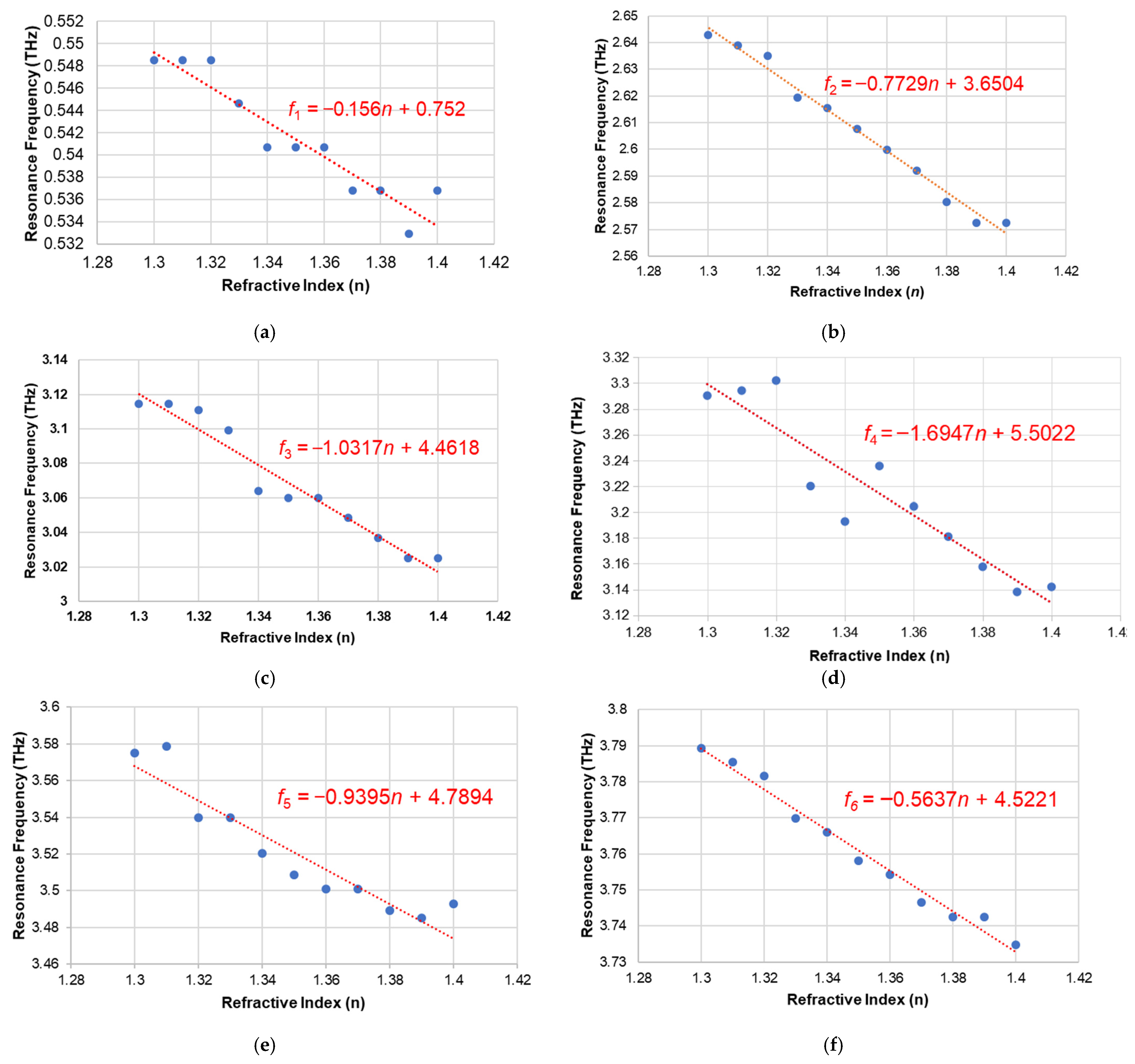 | Frequency Band (f0) | Frequency (THz) | Sensitivity (S) (GHz/RIU) | FoM | Q-Factor |
