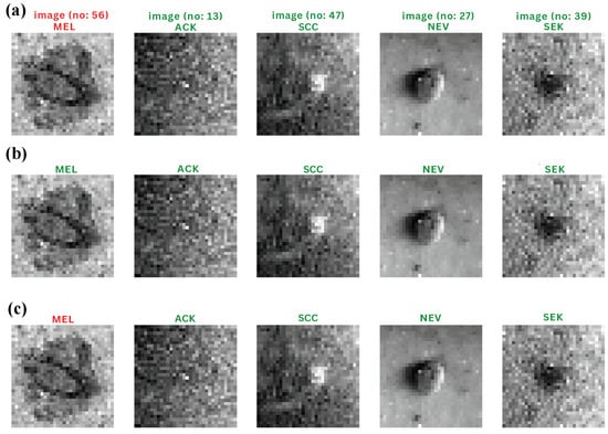 Representative qualitative classification outcomes for the three boosting models on the PAD-UFES-20 test set. Each panel shows correctly and incorrectly classified lesion examples, with predicted and true labels indicated above each image (green = correct, red = misclassified). The models compared are (a) CatBoost, (b) XGBoost, and (c) LightGBM, all trained on ConvMixer-derived features. The figure illustrates inter-model differences in visual decision patterns and highlights CatBoost’s comparatively higher consistency across lesion categories.
