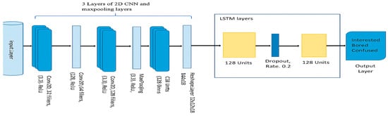 Two stacked LSTM layers, each with 128 hidden units, were then used to capture temporal dependencies across sequential facial frames. Dropout layers (rate = 0.5) were introduced after each LSTM layer to mitigate overfitting by randomly deactivating neurons during training. Finally, a fully connected dense layer with three output units was applied, corresponding to the target emotion categories: interested, bored, and confused. A SoftMax activation function generated normalized probability distributions over the three classes, enabling robust classification.