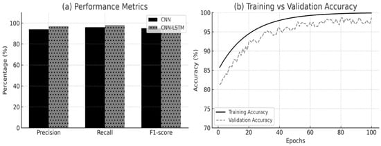 The proposed CNN-LSTM architecture integrates convolutional layers for spatial feature extraction with recurrent LSTM layers for temporal sequence modeling. Specifically, three convolutional layers were employed with 32, 64, and 128 filters, respectively, each using a kernel size of 3 × 3 and ReLU activation. Each convolutional layer was followed by a max-pooling layer (2 × 2) to progressively reduce dimensionality while retaining key features. The final convolutional output was flattened and reshaped into a sequential format compatible with recurrent processing.